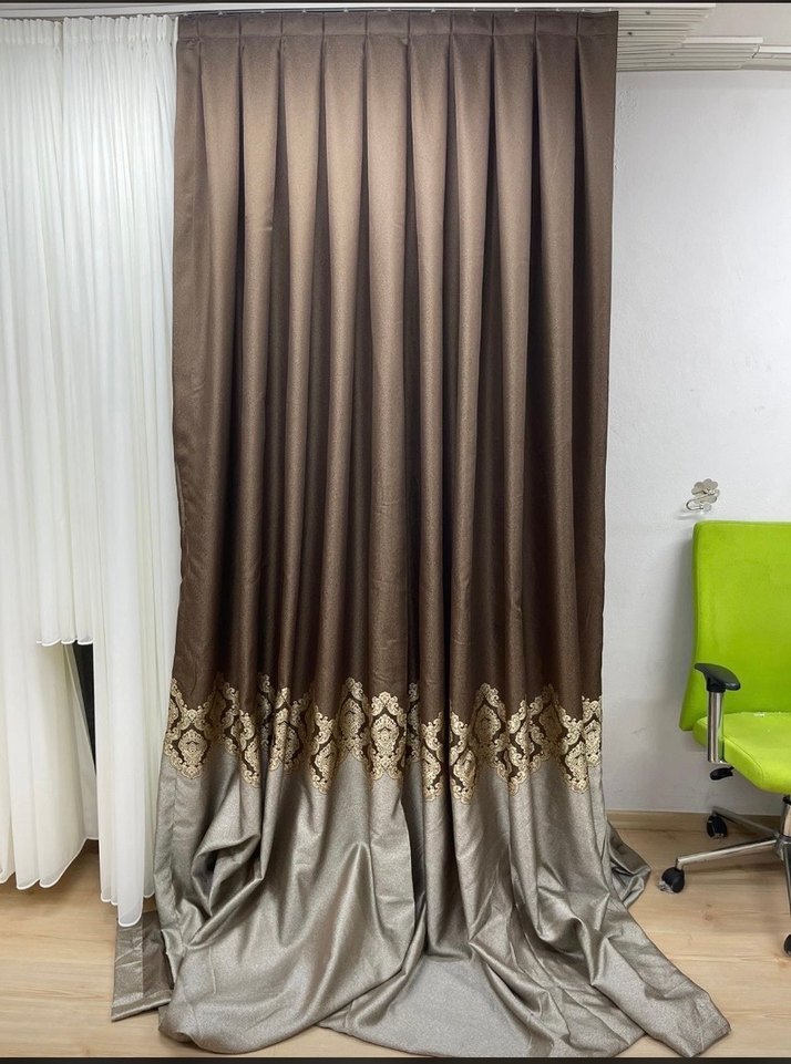 Kahverengi ve gri renklerin kullanıldığı, alt kısmında nakışlı desenler bulunan klasik tarzda fon perde. Kumaşı düzgün ve şık bir şekilde dökülür.