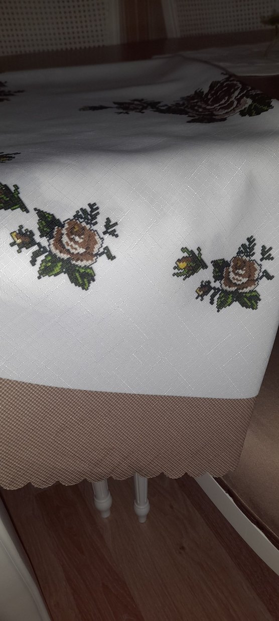 Bu masa örtüsü, beyaz zemin üzerinde kahverengi nakışlı çiçek desenleri ve gri kenarı ile klasik bir görünüm sunar.