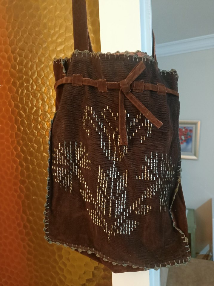 Koyu kahverengi süet malzemeden yapılmış,tel kirma nakışlı ve detaylı, bağcıklı bohem tarzda kadın çantası.