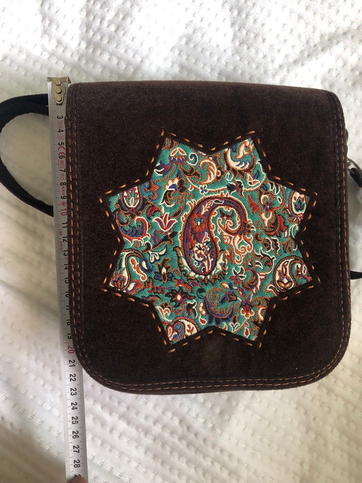 Kahverengi süet kadife kadın çanta, nakışlı desenler ve tokalı kapanışa sahiptir, bohem tarzını yansıtır. Günlük kullanım için uygundur. Hiç kullanılmadı