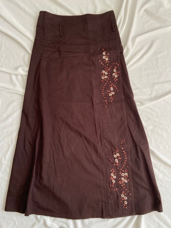 Kahverengi renkli uzun etek, nakış detayları ve drapeli tasarımıyla bohem tarz sunar. İşleme ve boncuk detay vintage etek