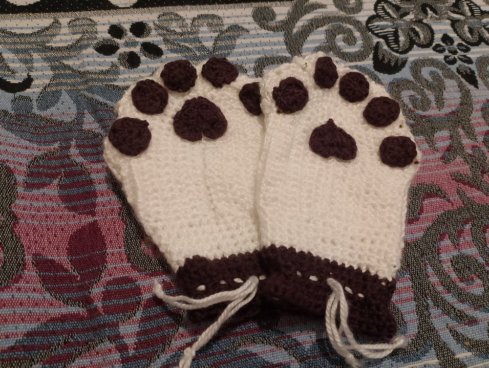 Yumuşak tığ işi kumaştan yapılmış, krem zemin üzerinde koyu kahverengi nakışlı pati deseni bulunan eldivenleri.