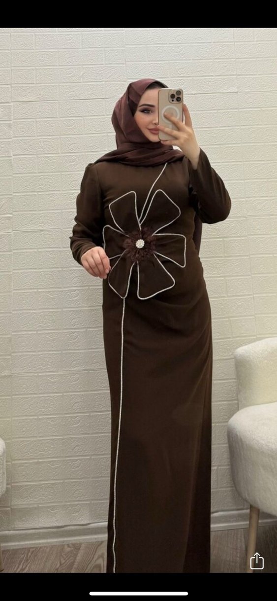 Kahverengi uzun kollu, yuvarlak yakalı, nakışlı büyük çiçek detayı ve kemerli düzenli kesim elbise. Günlük kullanıma uygun, minimalist tarzda. Beden etiketi yoktur özel diktirdim çünkü giyen kişi 75 kilo 162 boyla giydi