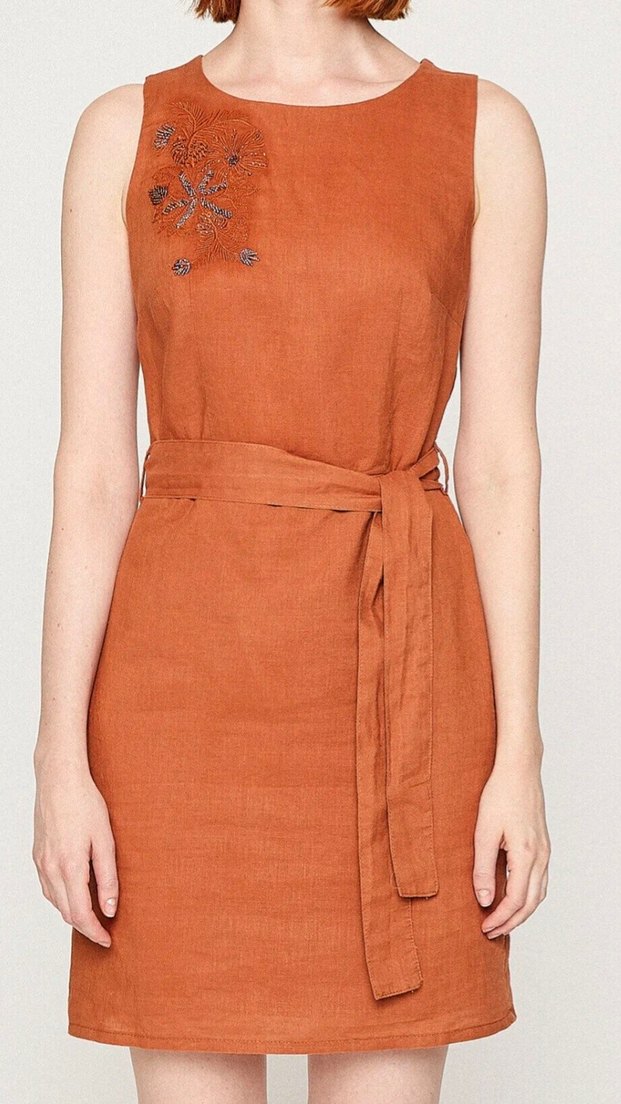 Kahverengi keten kumaştan, boncuk nakışlı detaylara ve kemerli bele sahip, kolsuz midi elbise. Kayık yaka ve normal kesim ile günlük kullanıma uygun. ✨