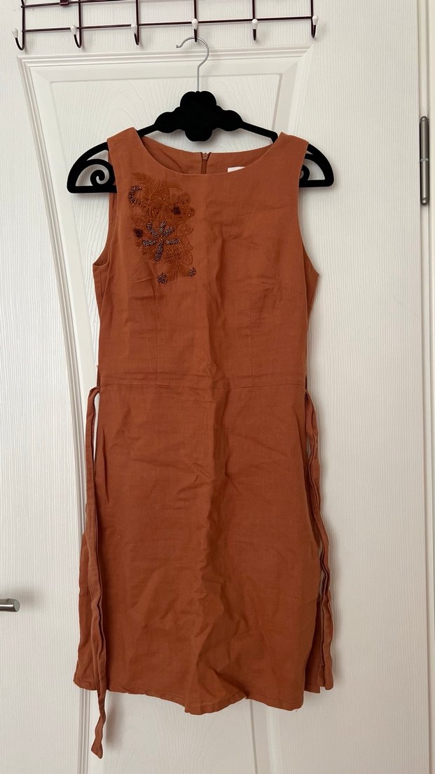 Kahverengi Nakışlı Kolsuz Midi Keten Elbise