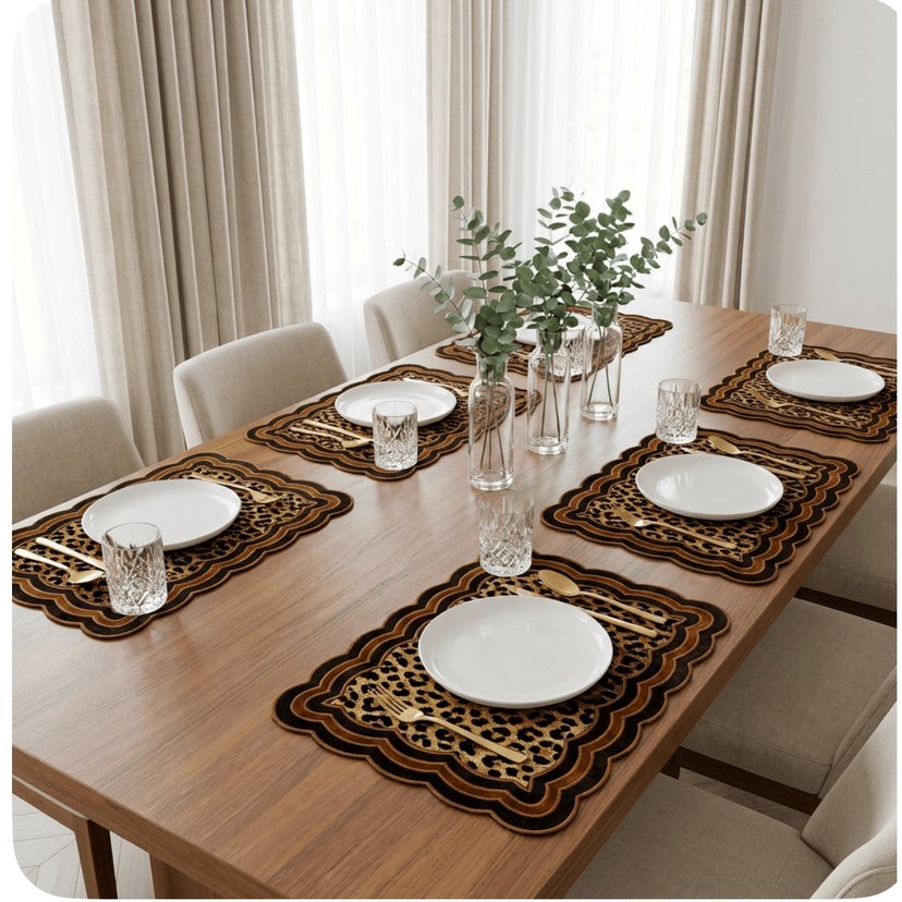 “Masada biraz cesaret her zaman işe yarar. Leopar desenli süyet amerikan servis ve runner. 6 kişilik Servis peçetesi ve runner fiyatıdır.