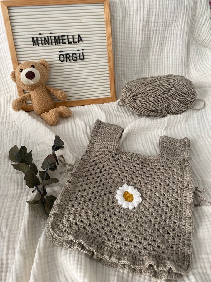 Nakışlı beyaz çiçek detaylı kahverengi örgü bebek elbisesi. Yumuşak örgüden yapıldı İstenilen yaşa göre ve aylık olarak hazırlanmakta Renk seçenekleri için lütfen mesaj atın