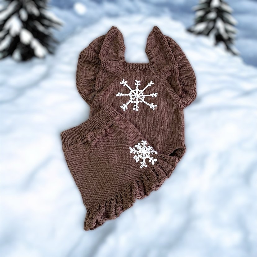 Koyu kahverengi örgü bebek kız takımı, uzun kollu, nakışlı kar tanesi desenli, fırfırlı etek ve omuz detaylıdır. ❄️