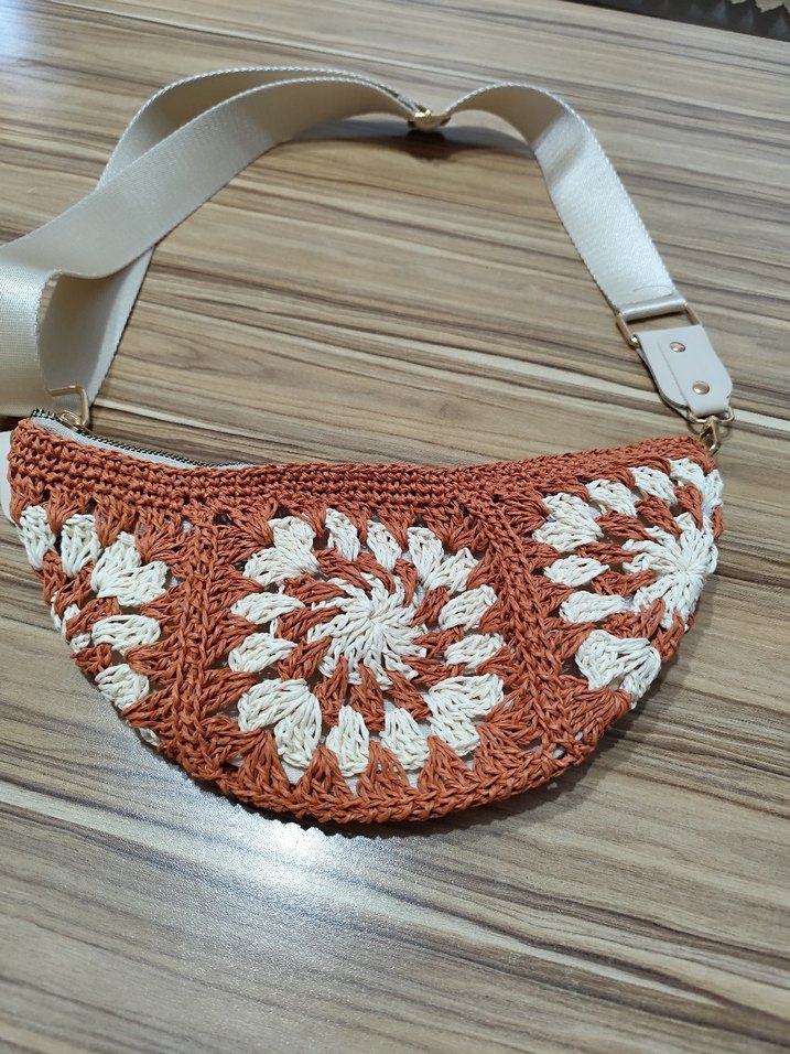 Hafif kahverengi, nakışlı örgü kumaştan yapılmış, dantel detaylı bohem çanta. Rahat taşıma için geniş bej askıya sahiptir.
