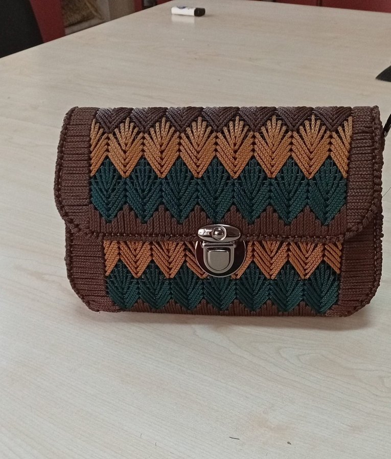 Kahverengi örgü çanta, nakışlı desenler ve tokalı kapanışa sahip, günlük kullanıma uygun bohem tarzda bir üründür.