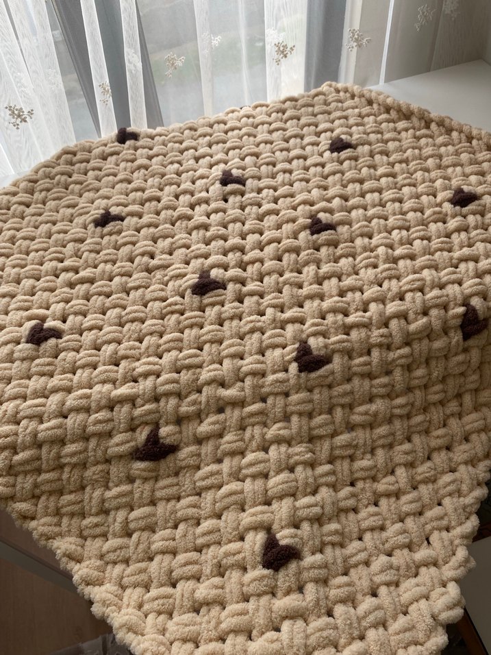 Kahverengi çocuk battaniyesi, dokulu örgü kumaş ve koyu renkte nakış detayları ile sıcak ve dekoratif bir dokunuş sunar. 90/90 ölçüsünde açık kahve üzerine koyu kahve kalpler
