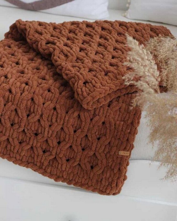 Kahverengi renkli, nakışlı desenli örgü çocuk battaniyesi, sıcak ve yumuşak bir dokunuş sağlar.