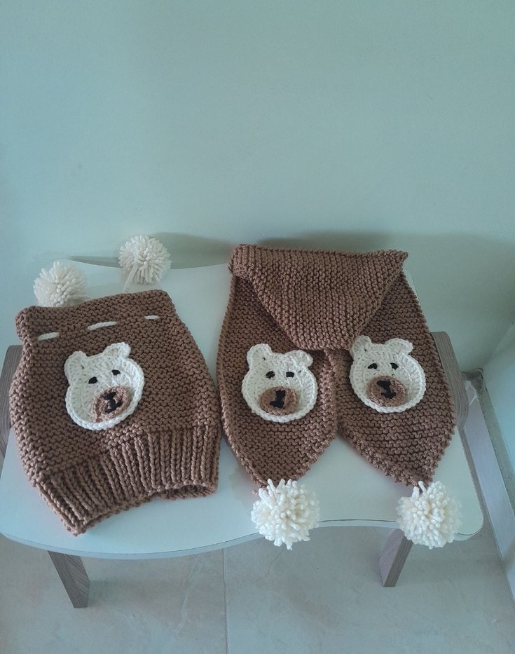 Kahverengi örgü çocuk bere ve atkı seti, nakışlı ayı yüzleri ve beyaz pompomlarla bohem tarzda rahat ve eğlencelidir. Ayı figürleri el örmesidir. pompomlar el yapımıdır. Sıfır, kullanılmamış üründür. Himalaya iple örülmüştür.