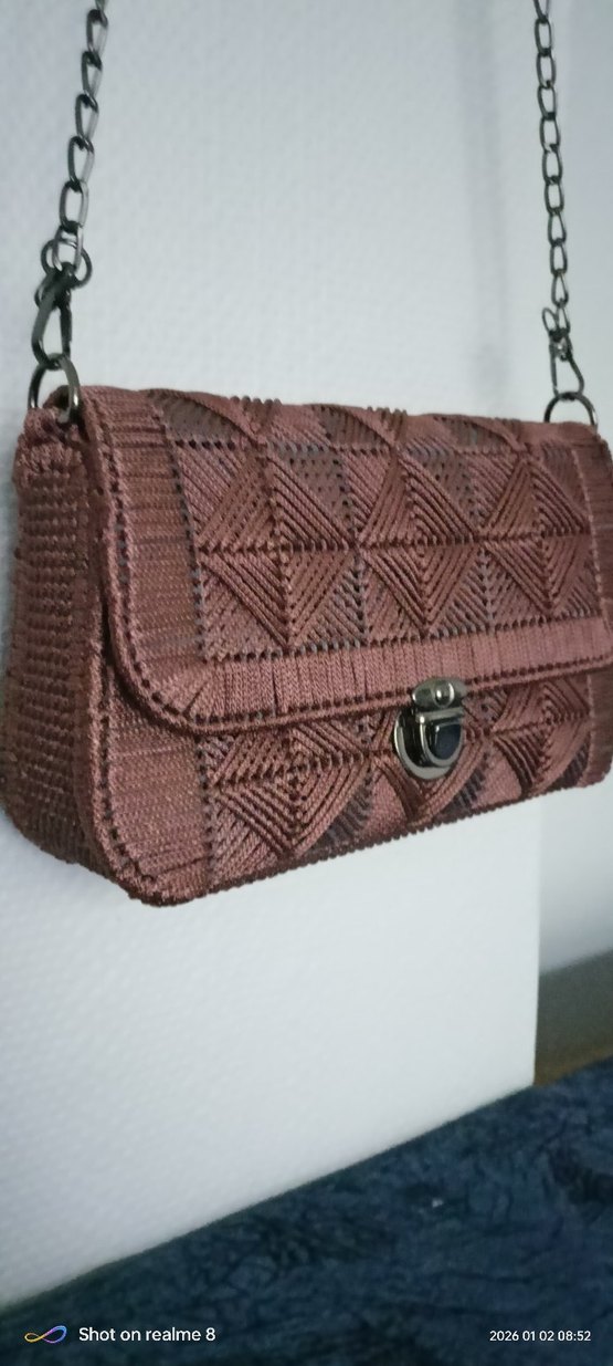 Kahverengi örgü kadın çanta, pilili detaylar ve nakışlı desenlerle bohem tarz sunar. Günlük kullanım için uygundur, koyu renklidir ve metal kilitlidir.