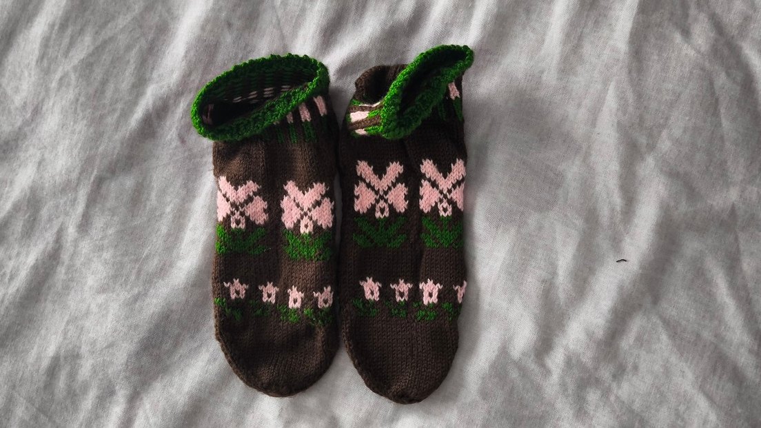 Kahverengi örgüden yapılmış, nakışlı çiçek desenli ve dolgu topuklu kadın terlikler, rahat ve bohem tarzı yansıtıyor.