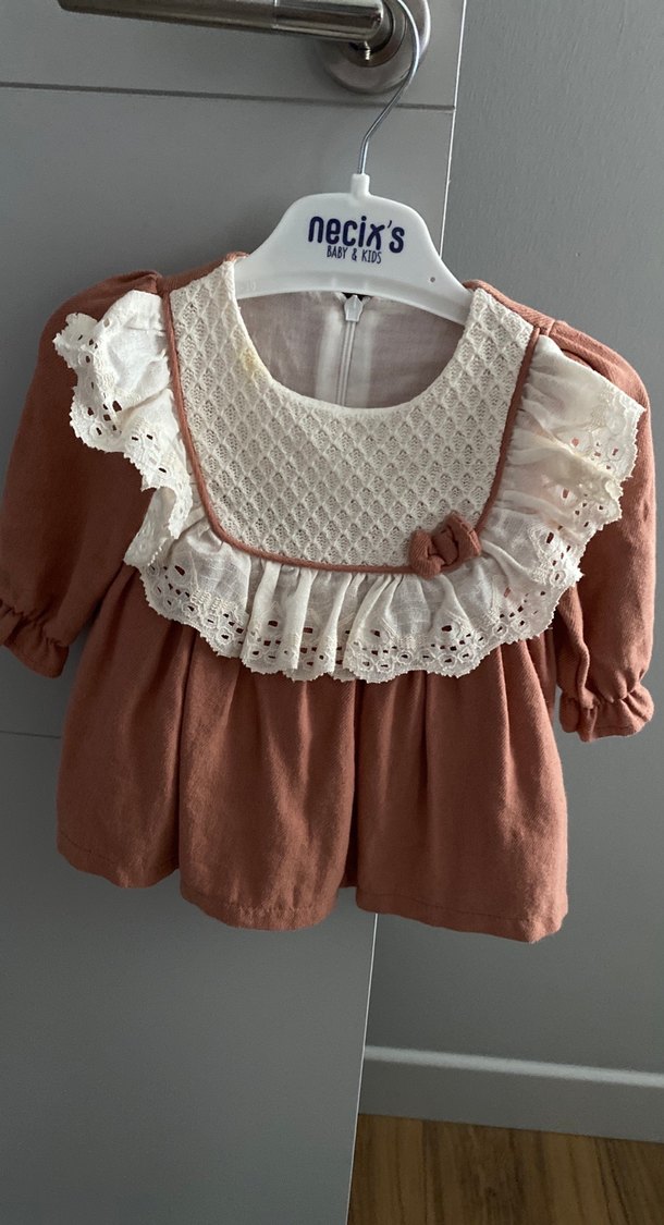 Uzun kollu, kahverengi pamuklu elbise, yuvarlak yakada nakışlı fırfır detaylıdır. Bohem tarzda, bol kesim ve pastel tonlardadır.
