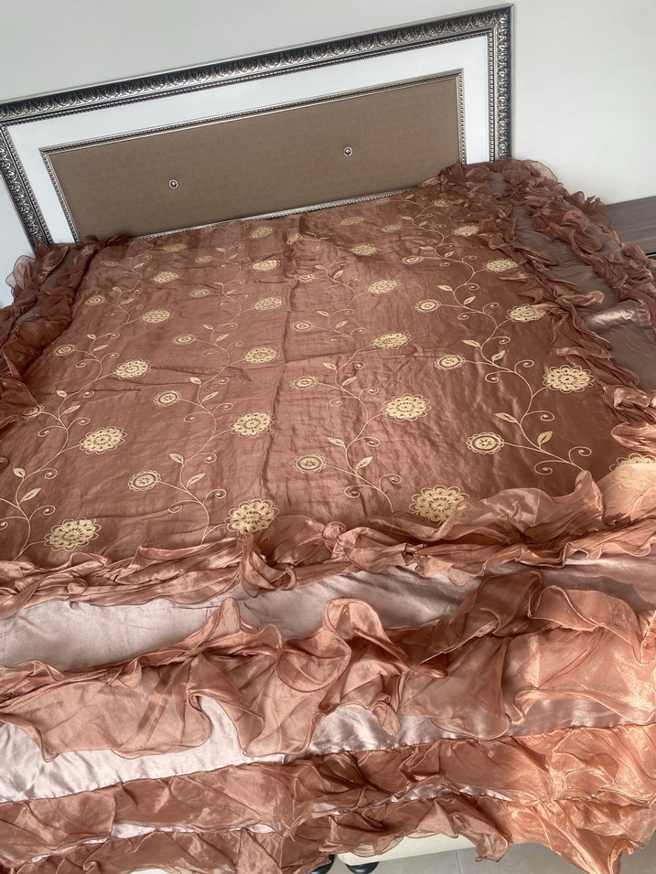 Kahverengi yatak örtüsü, parlak kumaş ve nakışlı çiçek desenleri ile kenarlarında fırfırlar bulunur, yatak odasına zarafet katar. ️