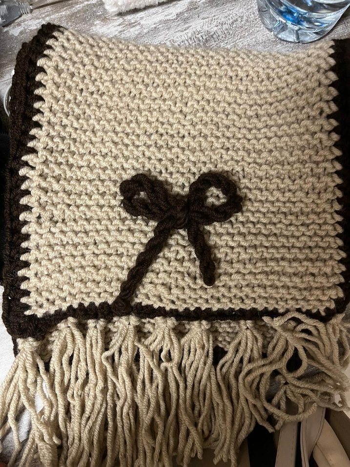 Kahverengi nakışlı fiyonk deseni ve püsküllü kenarları olan rahat ve atkı