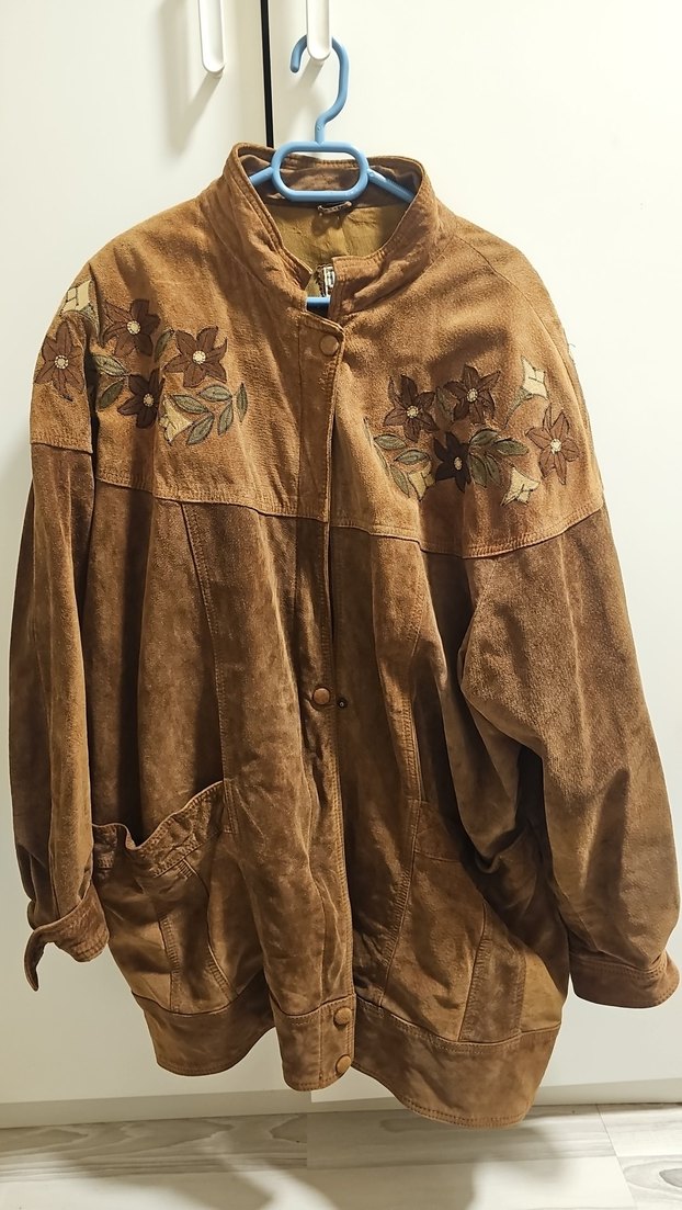 Kahverengi süet ceket, nakışlı çiçek desenleri, düğmeli kapama, bol kesim, uzun kollu ve yaka detaylı bohem vintage tarzında. 46-48 beden oversize şekilde giyilebilir.