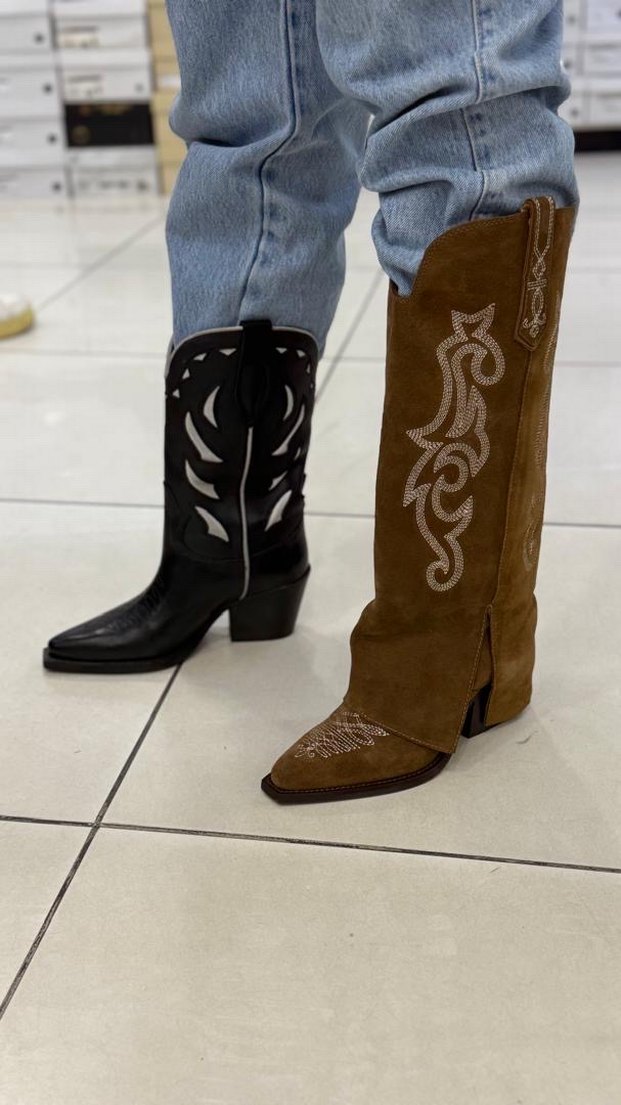 Kahverengi süet diz boyu botlar, nakışlı desenler ve kalın topuk içerir. Kemer detaylı, günlük sokak stili için uygundur. Hakiki deri ve süet beden sorabilirsiniz çok şık ve rahat kalıp