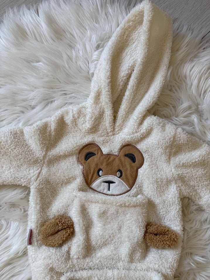 Yumuşak, açık kahverengi kumaş üzerine nakışlı ayı figürlü kapüşonlu ve cepli alt üst takım