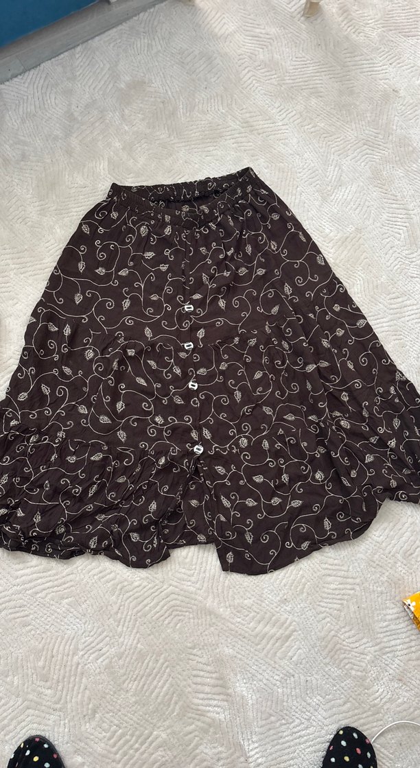 Kahverengi nakışlı uzun eteği, volan detaylıdır. Yumuşak keten kumaştan, bol kesimle rahat günlük kullanım sağlar. Beli lastikli Her bedene uyar