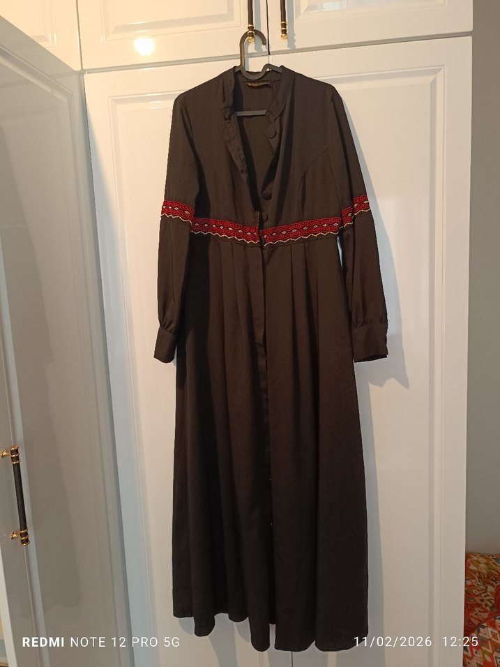 Uzun kollu, bol kesim ve kahverengi yumuşak kumaştan yapılmış, yakası kesik ve nakışlı, kemerli kadın elbisesi. Sade ve bohem tarzlara uygundur.