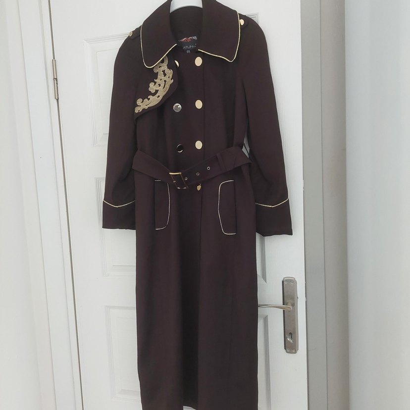 Kahverengi, nakış detaylı uzun kadın kaban. Notlu yaka, uzun kollu ve kemerli, rahat kesim. Vintage gotik tarzda, klasik şıklık sunar.
