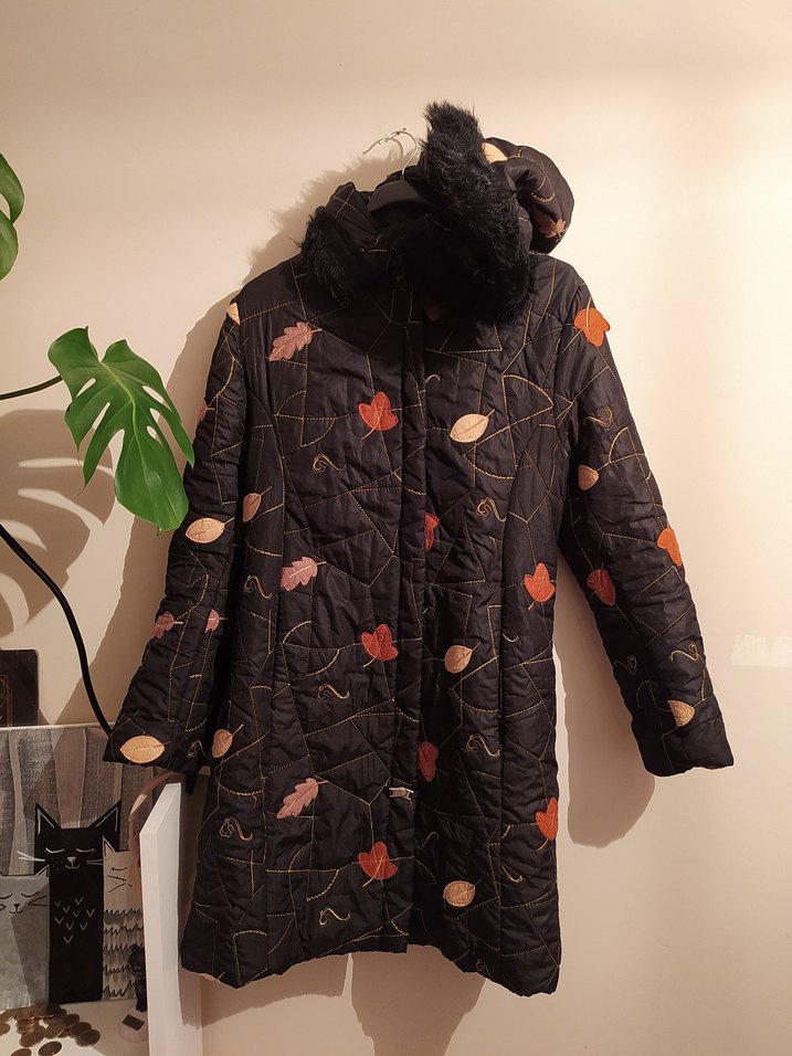 Nakışlı yaprak desenleri ve kürk detaylı yakası olan uzun kahverengi kışlık mont. Bol kesim, uzun kollu ve çentikli yaka, yumuşak ve sıcak kumaştan, rahat sokak giyimi için uygundur. sıfırları 4 binden başlıyor