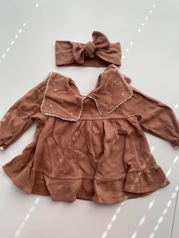 Kahverengi, bol kesim kız elbisesi uzun kollu, yakalı ve fırfırlı detaylara sahip. Nakışlı ve pamuklu kumaştan, bohem tarzında. Aynı kumaştan saç bandı ile birlikte. Kumaşı kaliteli mini elbise