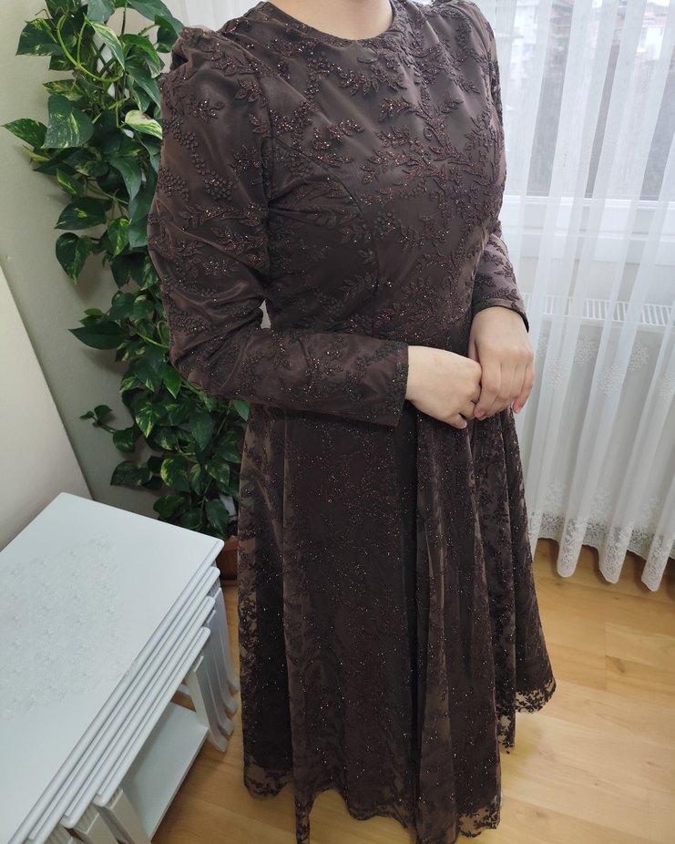 Koyu kahverengi, nakışlı detaylara sahip, uzun kollu, yuvarlak yakalı, drapeli, vintage tarzda, modest kesim uzun elbise. Düğün için uygundur.