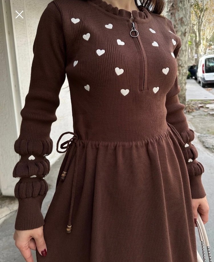 Bu kahverengi uzun triko elbise, yuvarlak yaka ve büzgülü uzun kollara sahiptir. Göğsünde beyaz nakışlı kalpler bulunur, rahat ve bohem bir tarza sahiptir sadece 1 kere kullandım temiz sağlam deforme yoktur . ❤️