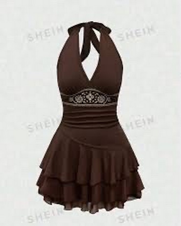 V yaka, askılı ve nakış detaylı kahverengi elbise, satenimsi kumaş ve fırfırlı eteklerle gotik parti tarzı sunar.