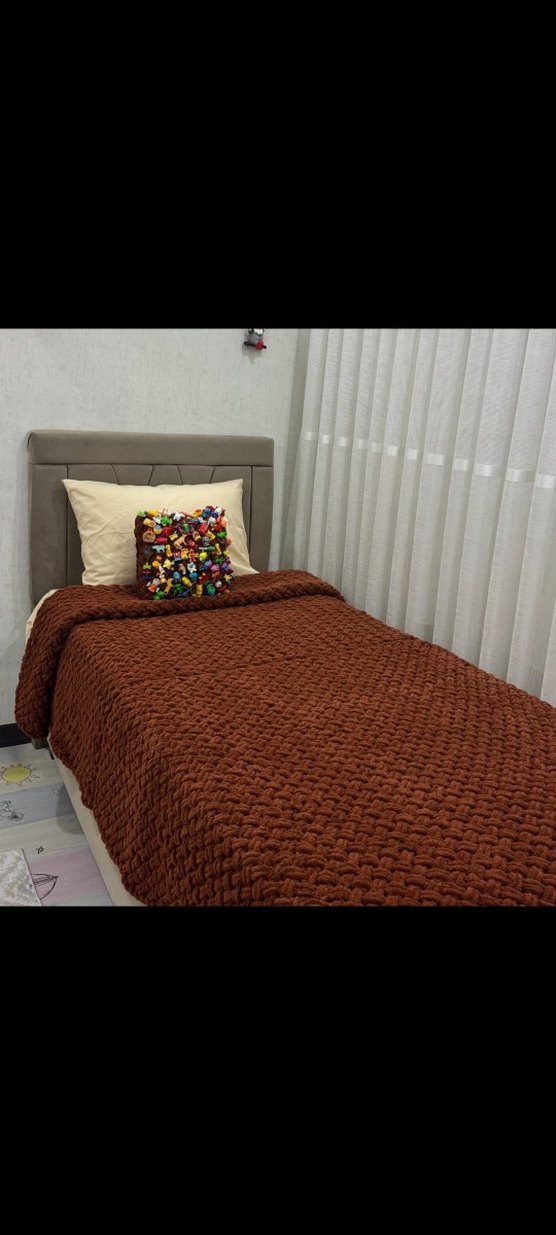 Kahverengi ve nakışlı dokulu yatak örtüsü, odaya sıcaklık ve şıklık katar. Renkli aksesuarlarla uyum sağlar. ️tv battaniyesi bebek battaniyesi istenilen renklerde yapılır.