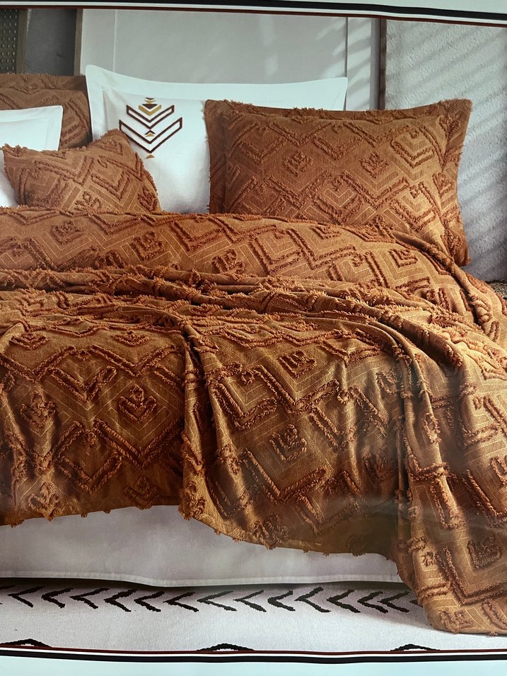 Koyu kahverengi, detaylı nakışlı desenlere sahip yatak örtüsü, yatak odasına doku ve sıcaklık katıyor. ️