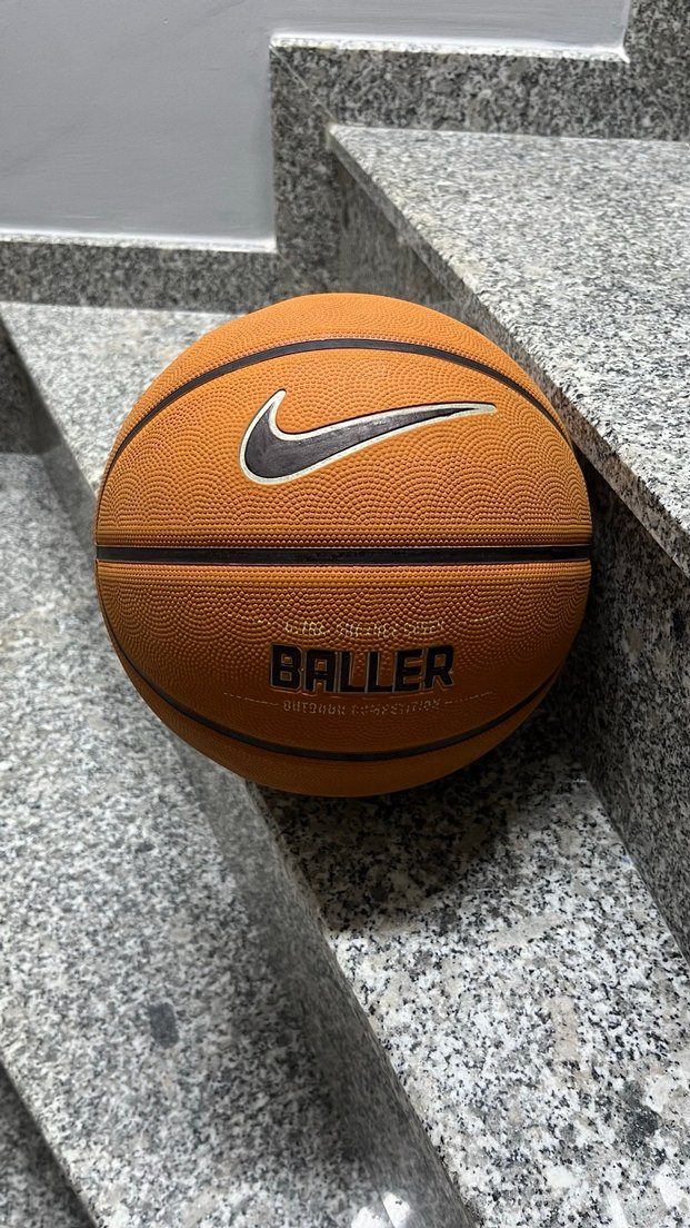 Koyu kahverengi Nike basketbol topu, "BALLER" yazılı, dokulu kauçuk yüzeye ve sokak stili tasarıma sahip. 7 numara