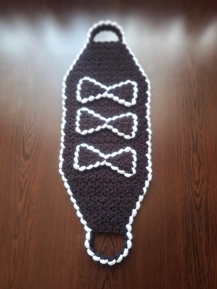 Üzerinde üç fiyonk desenli, her iki ucunda tutma yeri bulunan siyah örgü banyo süngeri.