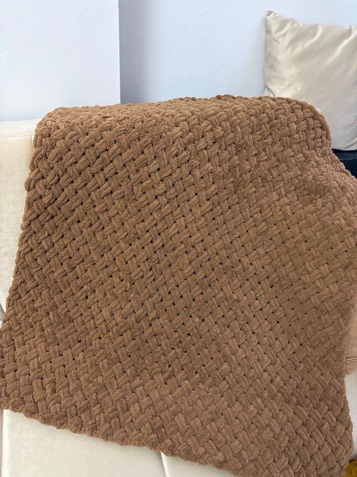 Yumuşak dokulu örgü kahverengi çocuk battaniyesi, sıcak tutar. Marka temsilidir