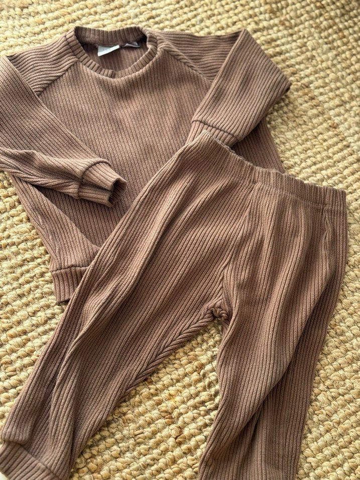 Kahverengi, uzun kollu ve bisiklet yakalı, örgü dokulu yumuşak keten bebek takımı. Rahat ve şık bir normcore tarz sunar.