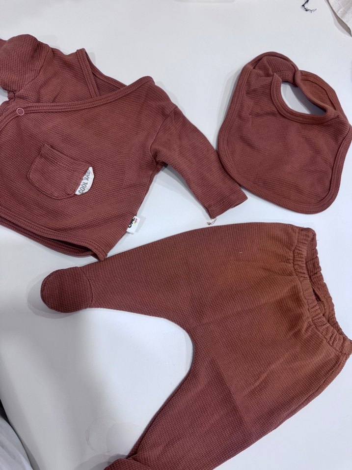 Koyu kahverengi örgü bebek takımı, uzun kollu üst, küçük cepli, pantolon ve önlükten oluşur, desensiz ve rahat bir settir.