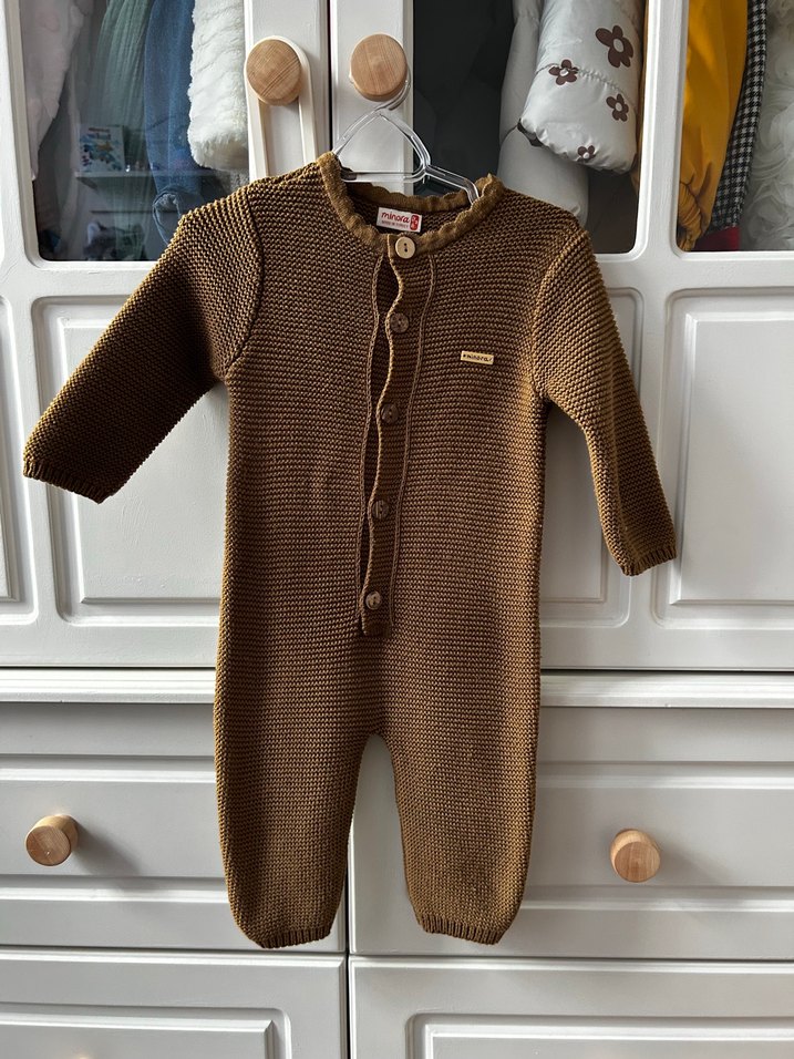Uzun kollu ve yuvarlak yakalı, yumuşak örgü kumaştan yapılmış kahverengi bebek tulumu. Ön kısmında düğmeli kapama vardır. 9-12 ay gerçekten çok şık bir tulum kızım 1.5!yaşındaykende oluyordu