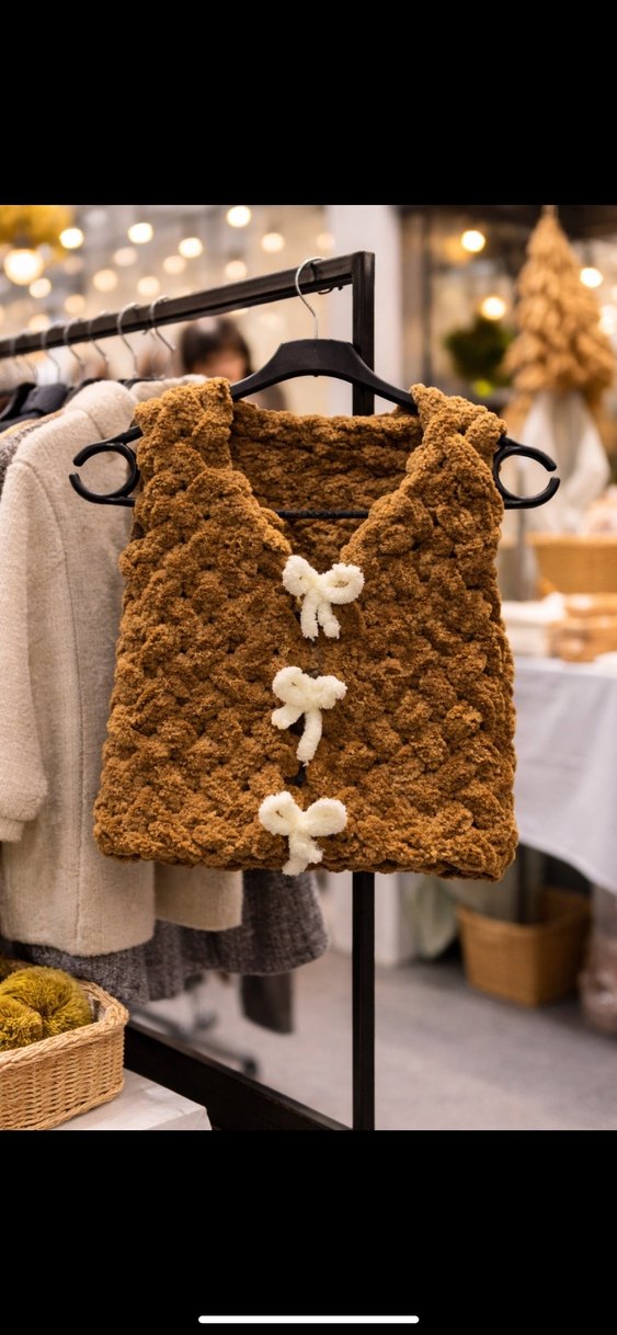 Kalın örgü dokusuyla kahverengi bebek yeleği, beyaz süslemeli bağcıklarla tamamlanmıştır.