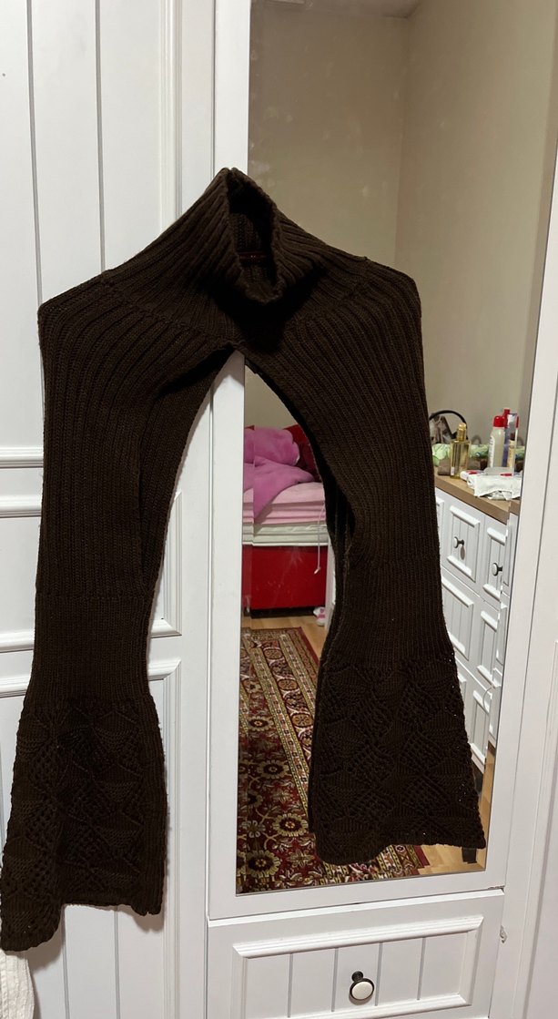 Kahverengi, boğazlı ve uzun kollu, midi boy örgü boğazlık. Rahat ve desen içermeyen yapıya sahiptir.