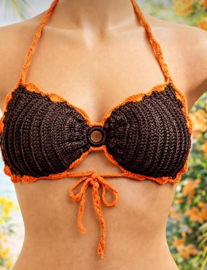 Fitted kesim kahverengi örgü bikini üstü, turuncu detaylı askılı, bohem tarzda plaj için uygun. ️