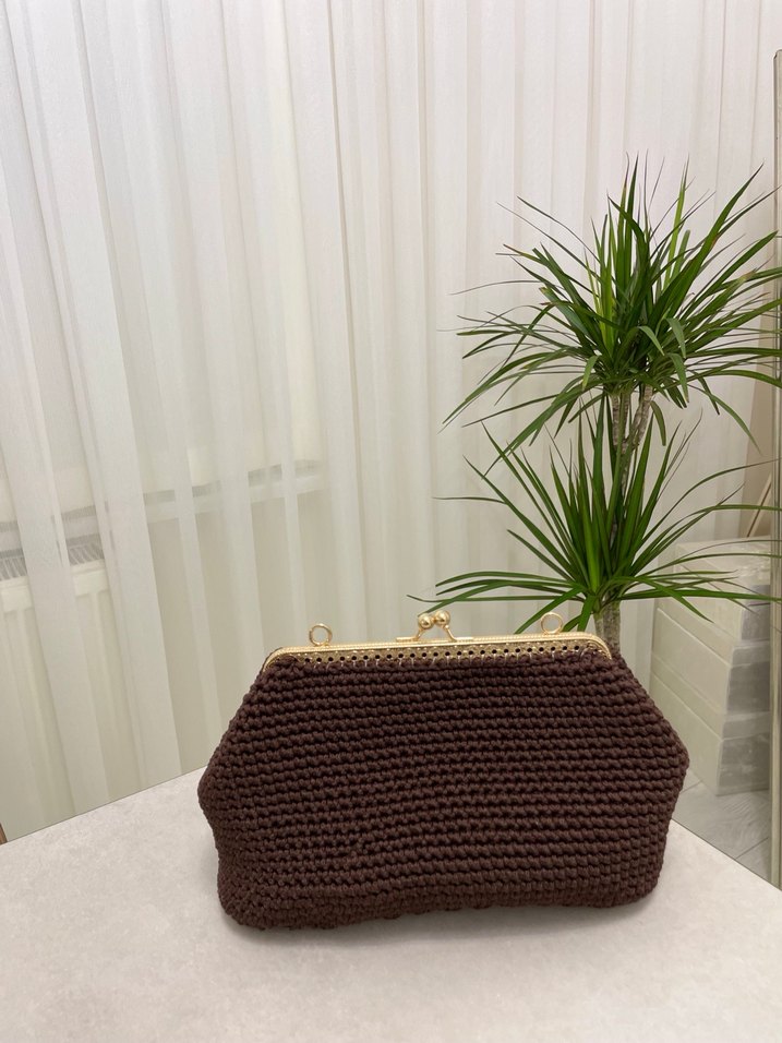 Koyu kahverengi örgü dokulu ve metal çerçeveli bohem tarzda clutch çanta. Desensiz, yumuşak örgü kumaştan yapılmıştır. İstenilen boyut örülebilir. İsteğe göre zincir ve alt taban eklenebilir.