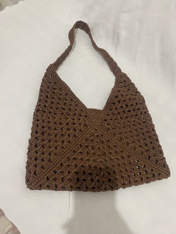 Koyu kahverengi, örgü dokulu, bohem tarzda kadın çantasıdır. Günlük kullanıma uygun, rahat ve retro bir görünüme sahiptir.