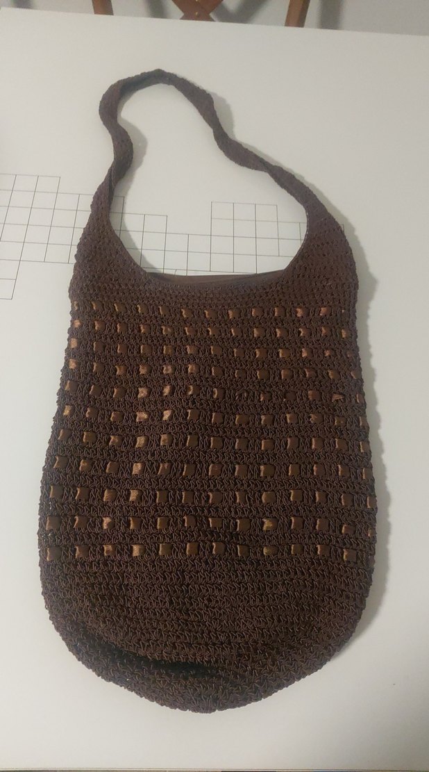 Koyu kahverengi, örgü tasarımlı bohem tarzda kadın çantasıdır. Yumuşak dokulu ve minimal görünümüyle günlük kullanıma uygundur.