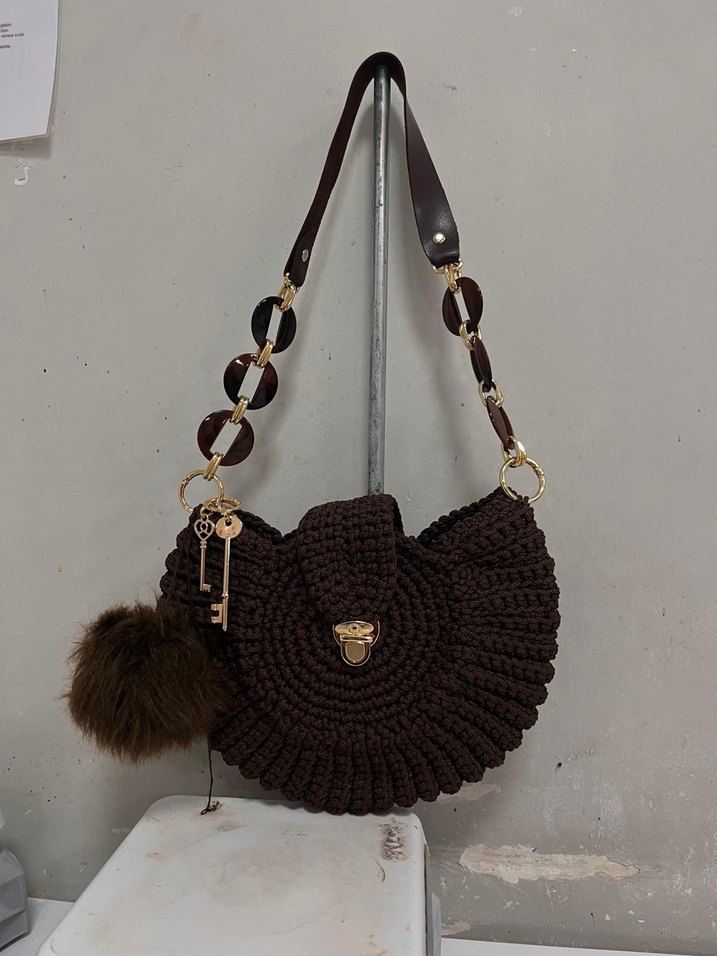 Koyu kahverengi örgü bohem tarzda, leopar desenli detaylar ve ponpon süsü bulunan yuvarlak kadın çantasıdır. Rahat tutma sapı halkalıdır.