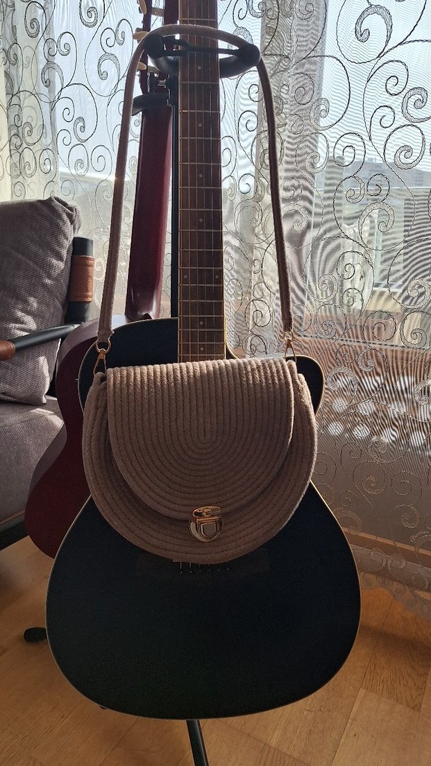 Kahverengi örgü dokuma, tokalı kapaklı, desen içermeyen bohem tarzda kadın çantası. Gri askılı ve günlük kullanıma uygundur.