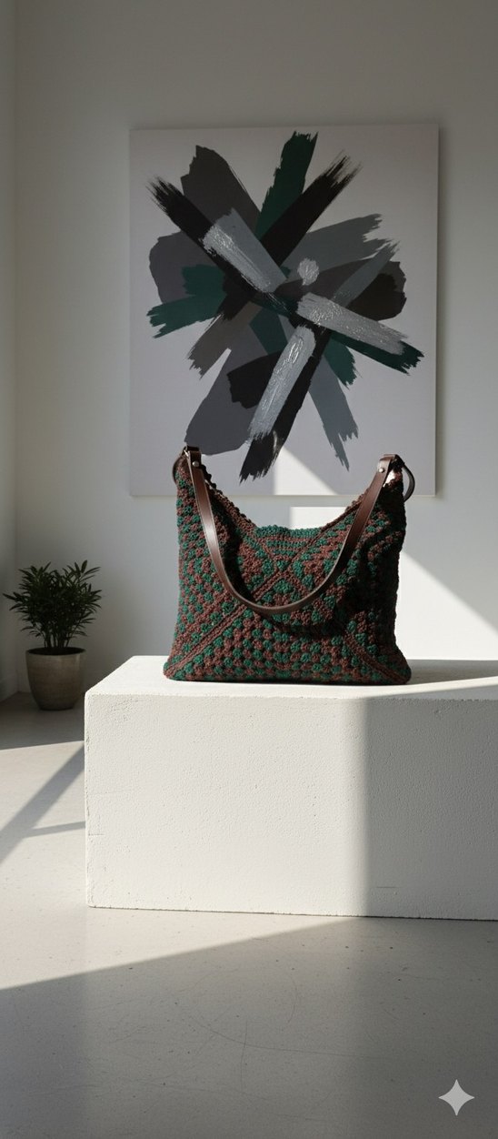 Bohem tarzda, kahverengi örgü malzemeden yapılmış, tokalı askılı kadın çantasıdır. Günlük kullanım için uygundur ve desensizdir.